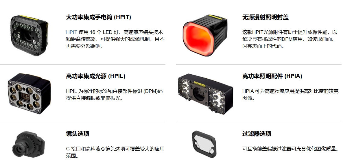 DataMan 370 经过验证的模块化设计使其可与其他 DataMan 读码器共享相同的照明、镜头和通信选项,从而提供较高的灵活性和易用性。新大功率集成手电筒 (HPIT) 选项可提供强大的照明能力,不再需要外部光源。
