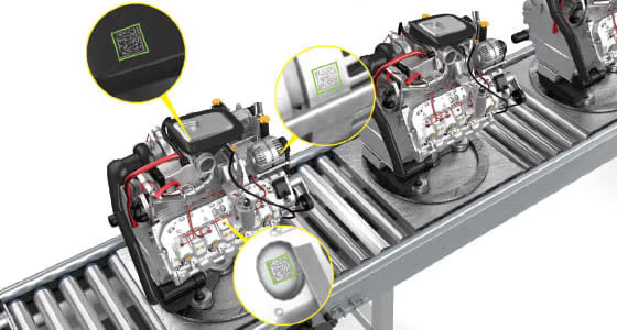 为引擎、传输和最终装配以及套件应用读取难读的二维 DPM 码。这包括圆形、反光和纹理表面上的激光蚀刻和点刻码。