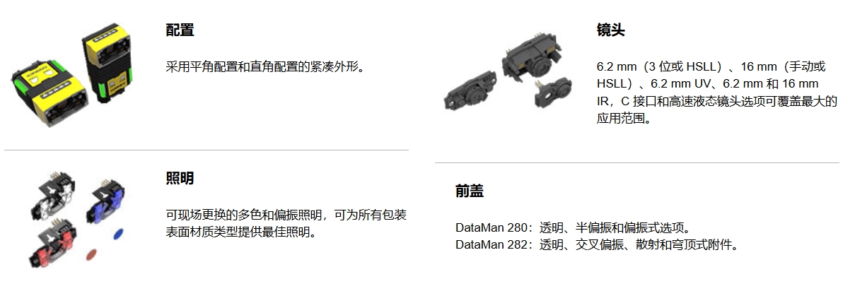 DataMan 280 系列固定式读码器十分灵活,其外形小巧,却能提供高级解码功能。只需进行最少量的设置,辅以可配置模块化配件来解决任何条码读取难题。