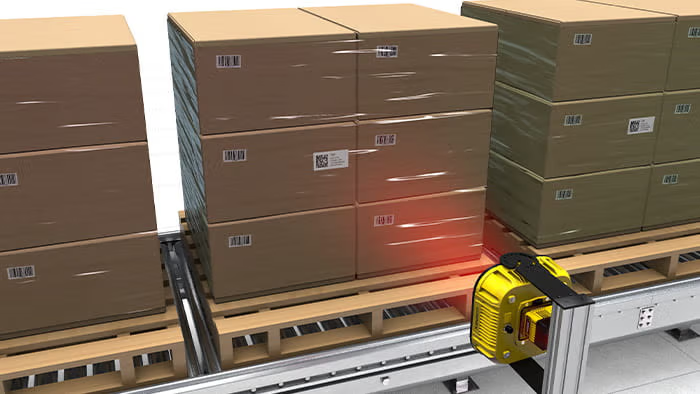 使用单个 DataMan 380 快速扫描物流仓库中整货盘的产品或包裹。