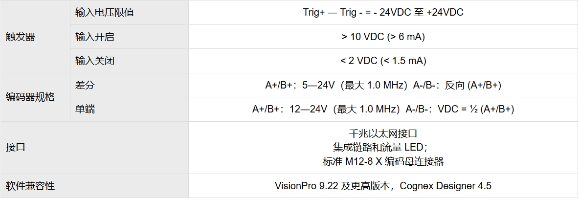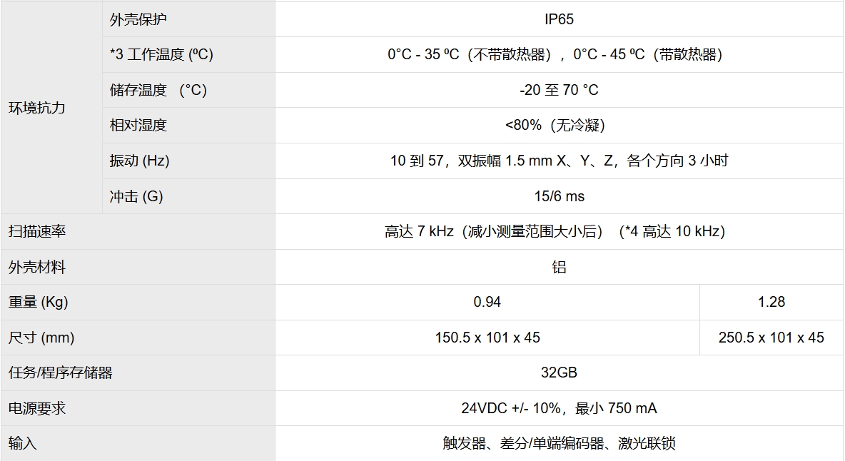 *2 Z 线性是测量范围内 250 个位置测量值的最大偏差,其中测量值是使用标准 Cognex 目标的 2 个曲线的平均值。