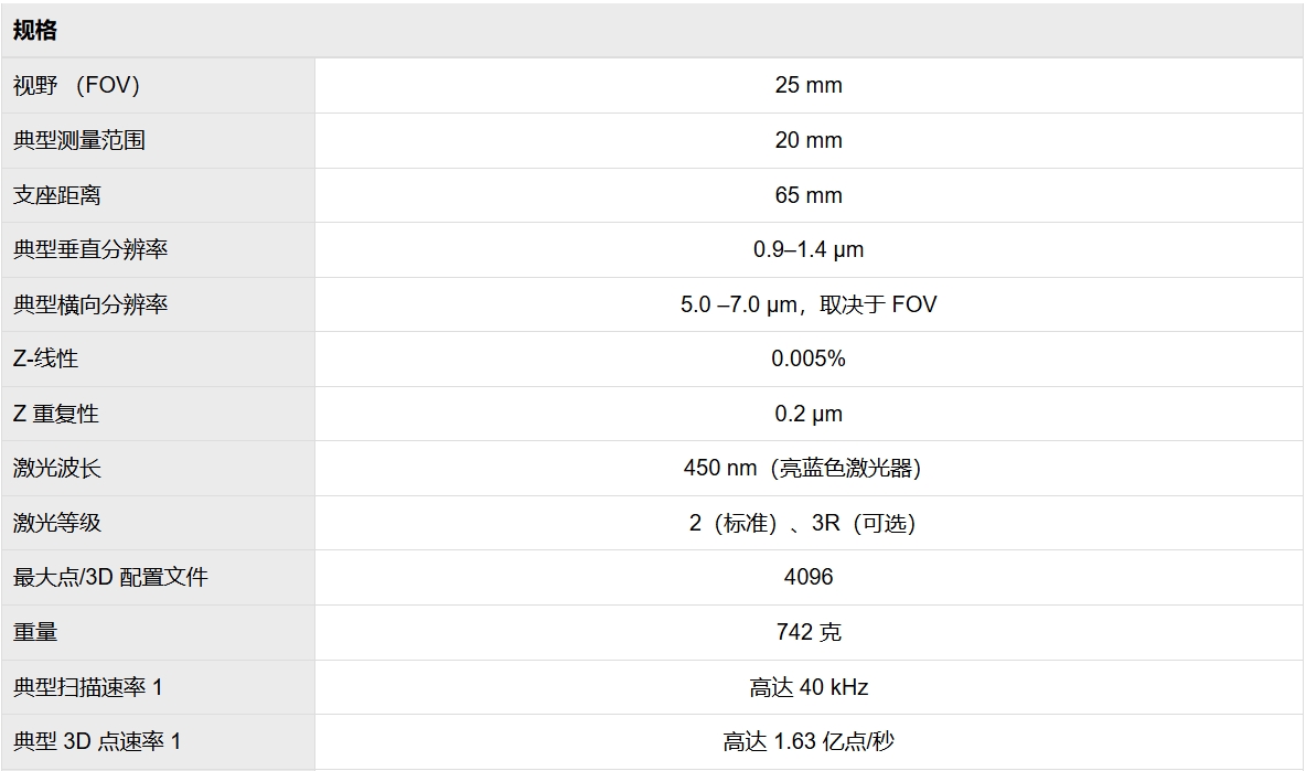 蓝色激光技术可生成高质量的 3D 图像,多达 4000 个 3D 点,垂直分辨率 <0.5 μm