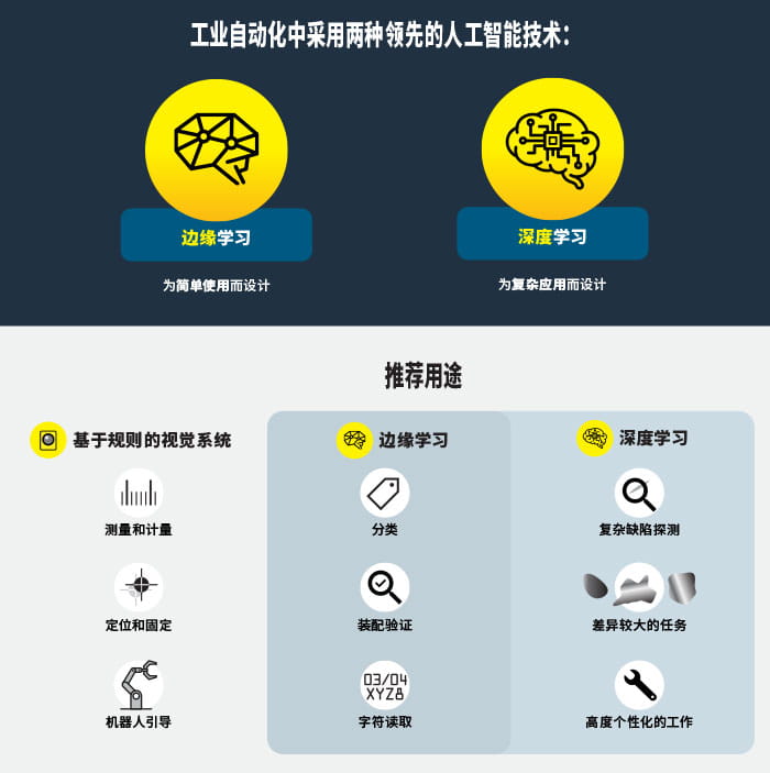 边缘学习 是一种旨在易于使用的 AI 技术。采用一套预先训练的算法,在设备上,即“边缘”进行处理。该技术易于设置,与基于深度学习的解决方案相比,需要更小的图像集(最少 5 到 10 张图像)和更短的训练时间。即使不是视觉专家,即使未拥有这一领域的经验,也可训练边缘学习工具,并在几分钟内生成检测结果。